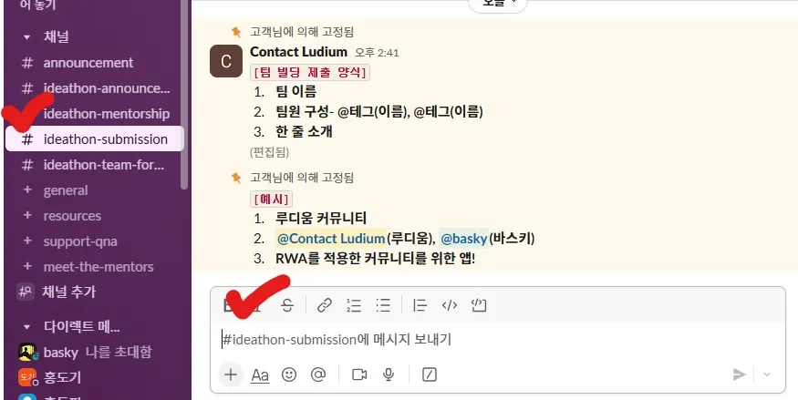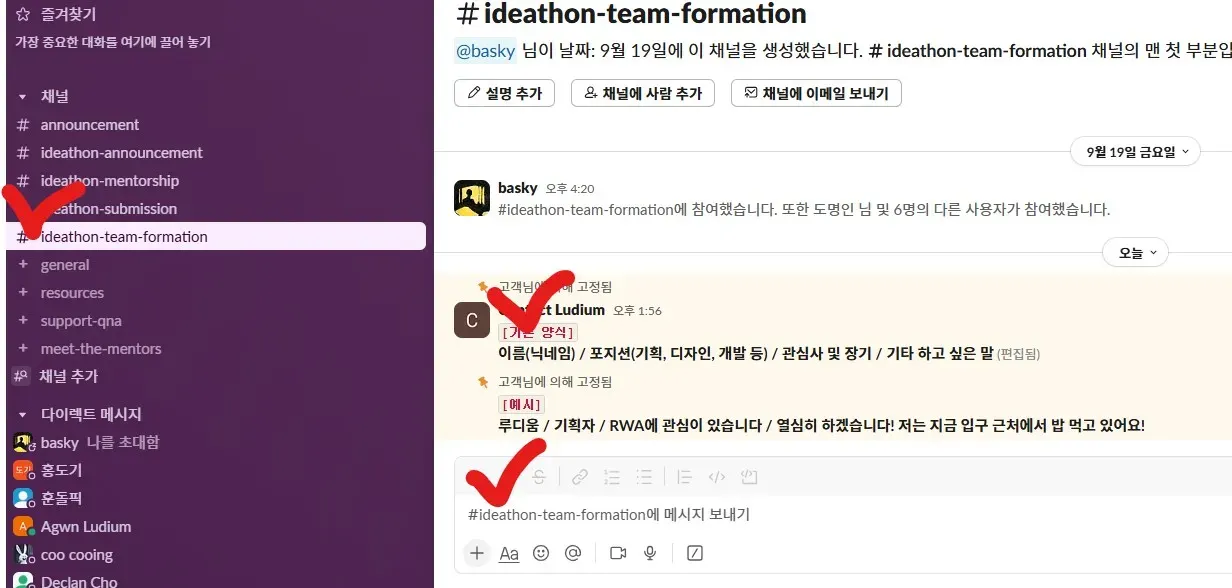 1. 주위 참여자에게 직접 접촉하거나, [ideathon-team-formation] 채널에 자기소개 올리기