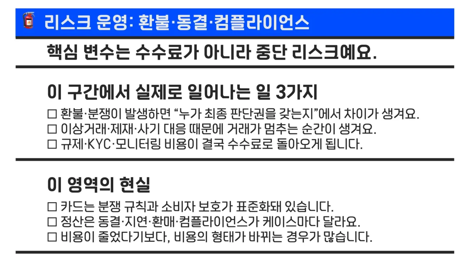 결제는 실패했을 때 비용이 너무 커서, 카드는 소비자 보호·분쟁 처리·사기 대응 같은 불편한 책임을 떠안아요.