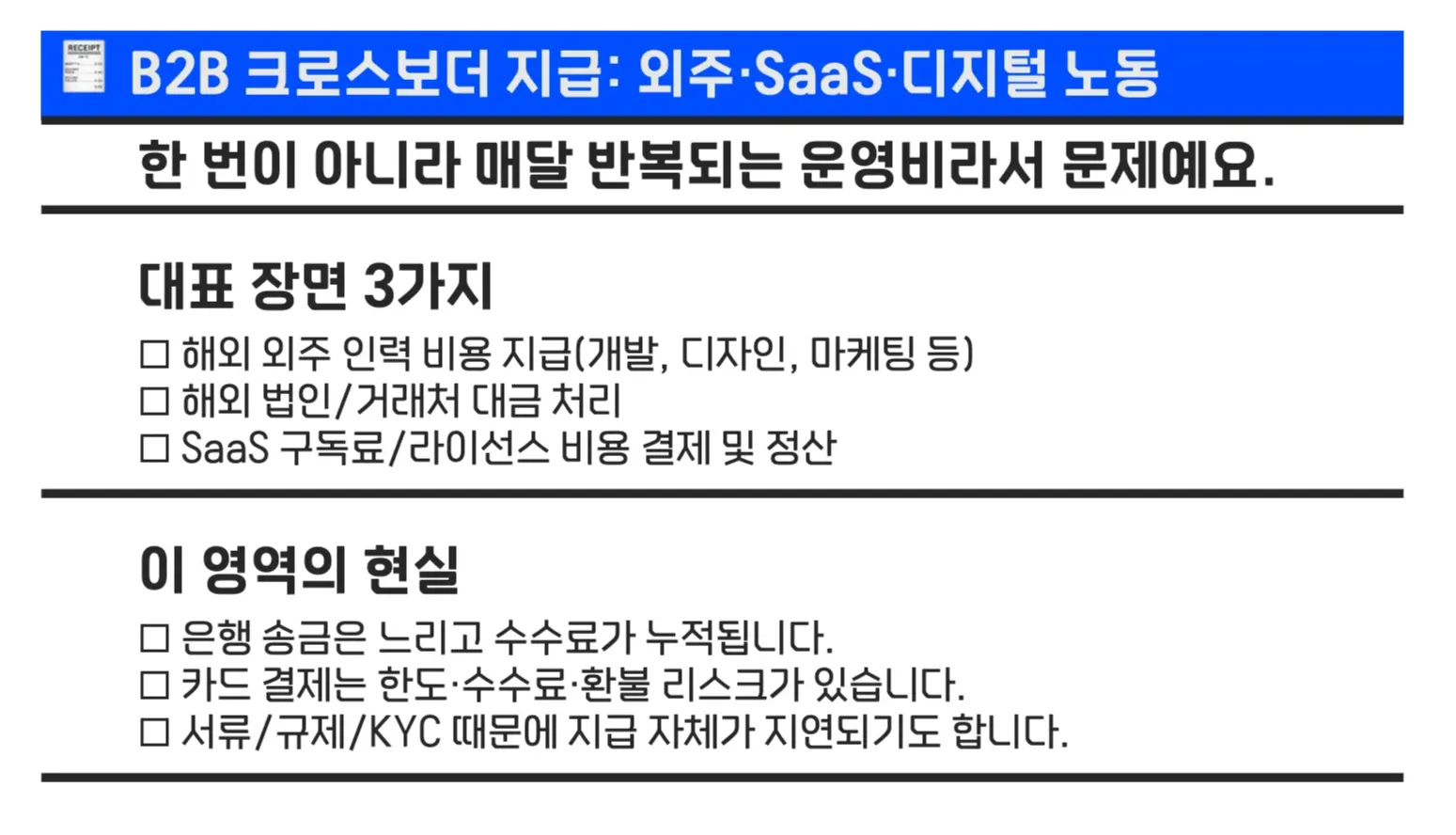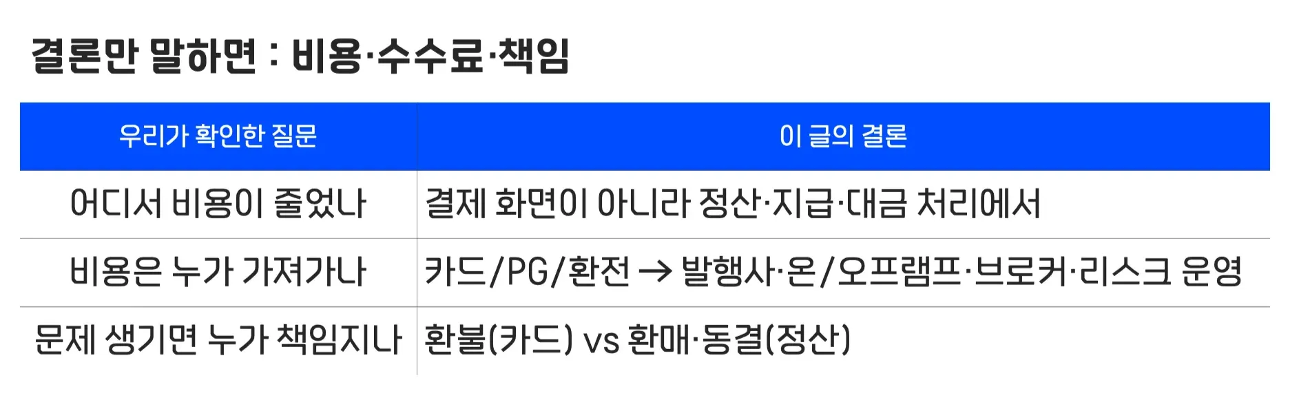 반면 정산·지급은 책임을 떠안는 주체가 분산돼 있고, 국가/업종/규제에 따라 비용이 쉽게 커집니다.