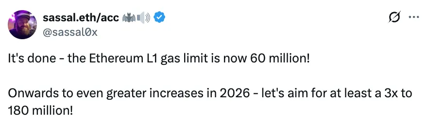 이미 합의된 로드맵이지만, 오늘 회의에서 최종 점검이 이뤄질 예정이에요. 원래 30M이었던 가스 리밋이 최근 60M을 거쳐 내일(1월 9일 예상) 80M까지 올라가요. 도로를 넓히는 것처럼, 이더리움 메인넷이 더 많은 트랜잭션을 한 번에 처리할 수 있게 됩니다. 개발자들은 2026년 말까지 이를 1억 8,000만까지 올리는 공격적인 목표를 갖고 있어요.